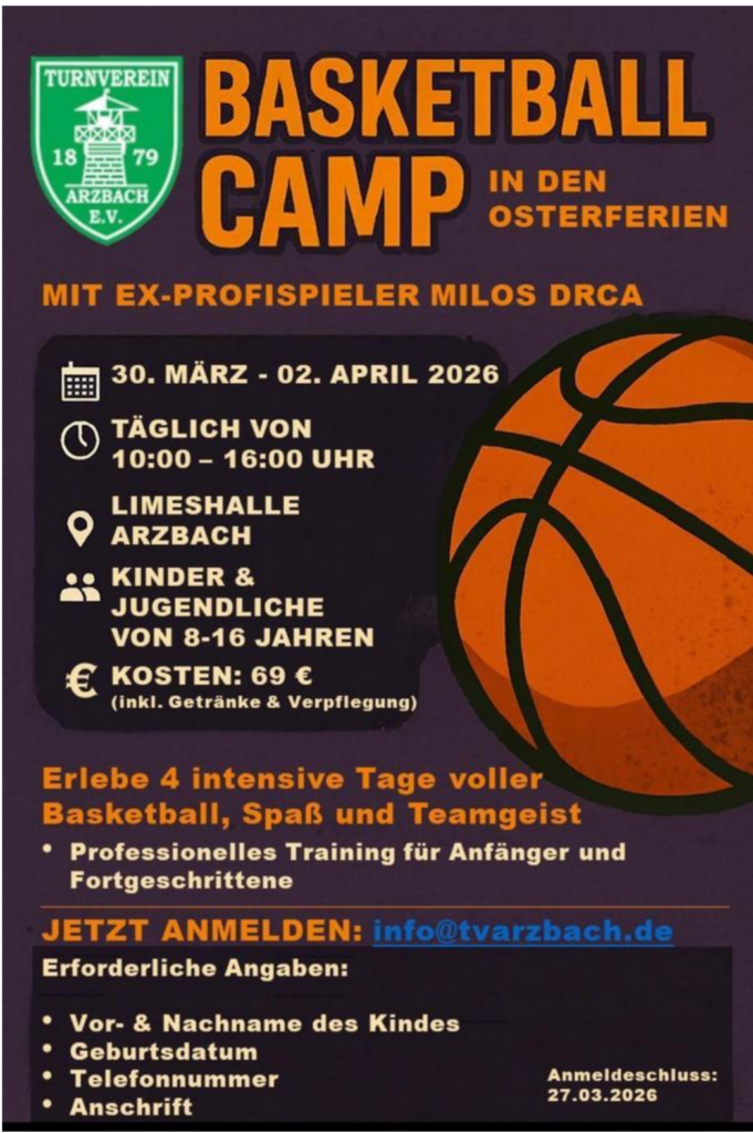 Das Basketballcamp des Turnvereins Arzbach feiert in diesen Osterferien 2026 seine Premiere – ein echtes Novum für den Standort, das jedoch keinerlei Abstriche bei der Qualität erwarten lässt. Vom 30.03. bis 02.04.2026 erhalten Kinder und Jugendliche erstmals die Gelegenheit, in der Limeshalle unter der Anleitung des erfahrenen Ex-Profispielers und Campleiters Milos Drca zu trainieren. Täglich von 10:00 Uhr bis 16:00 Uhr erleben die Teilnehmenden vier intensive Tage voller Techniktraining, spielerischer Übungsformen und Teamarbeit. Das Camp richtet sich an Mädchen und Jungen zwischen 8 und 16 Jahren – sowohl Anfänger als auch Fortgeschrittene werden gezielt gefördert. Der Teilnahmebeitrag von 69 € umfasst Getränke und Verpflegung, sodass die Kinder rundum betreut sind. Der Verein legt großen Wert auf ein motivierendes Umfeld, in dem Fairplay, Respekt und Freude am Sport im Mittelpunkt stehen. Die Registrierung erfolgt per E-Mail an: info@tvarzbach.de Das neue Camp setzt damit einen starken sportlichen Akzent in Arzbach. Die ersten zweistelligen Anmeldezahlen bestätigen das große Interesse – noch sind Plätze frei, doch der Zulauf zeigt: Wer dabei sein möchte, sollte nicht zu lange warten.
